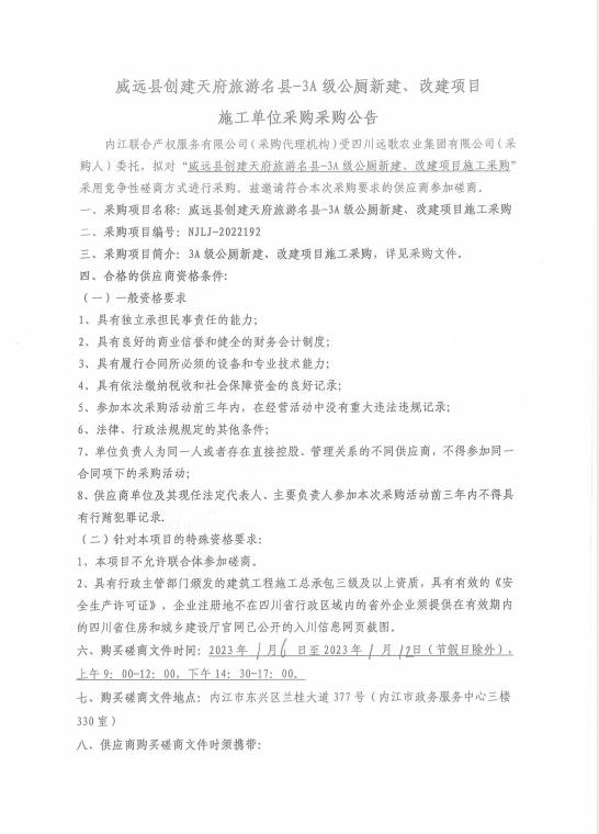 威远县创建天府旅游名县-3A级公厕新建、改建项目施工单位采购采购公告