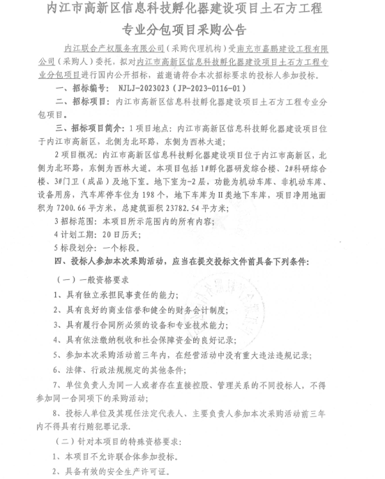 内江市高新区信息科技孵化器建设项目土石方工程专业分包项目采购公告