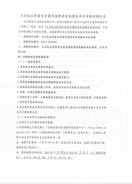 大石包水库移民安置实施阶段咨询服务单位采购采购公告