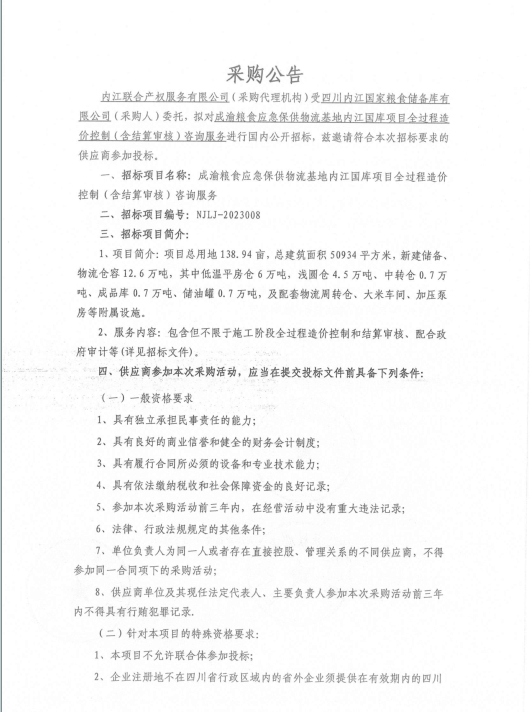 成渝粮食应急保供物流基地内江国库项目全过程造价控制(含结算审核)咨询服务采购项目采购公告