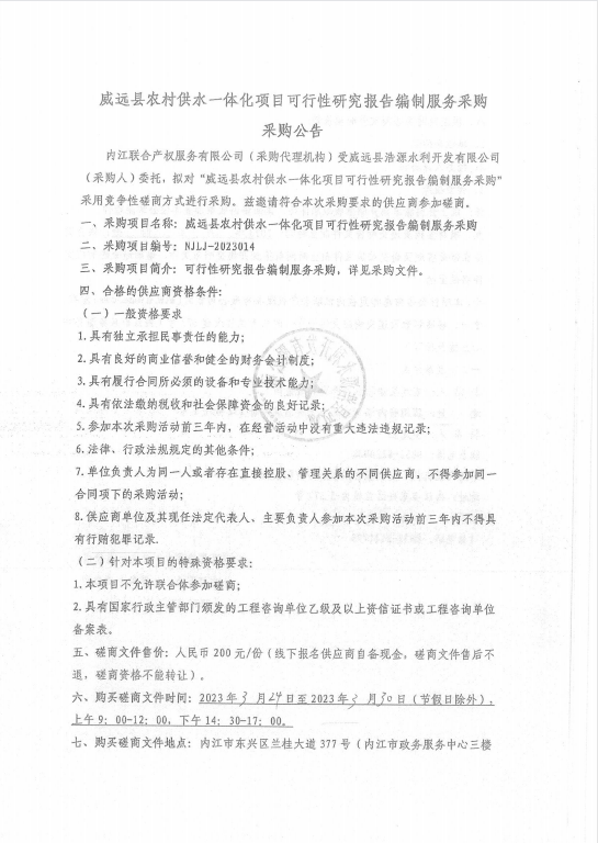 威远县农村供水一体化项目可行性研究报告编制服务采购采购公告