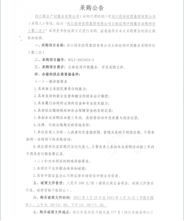 内江投资控股集团有限公司主体信用评级服务采购项目(第二次)采购公告