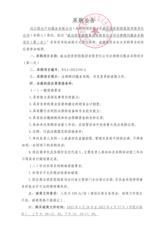 威远投资控股集团有限责任公司法律顾问服务采购项目(第二次)采购公告