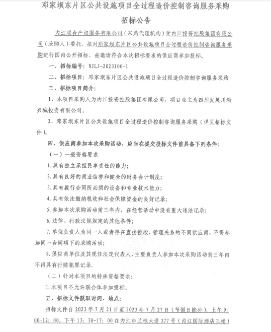 邓家坝东片区公共设施项目全过程造价控制咨询服务采购招标公告