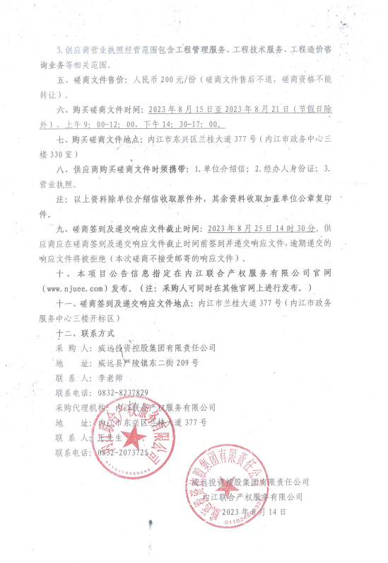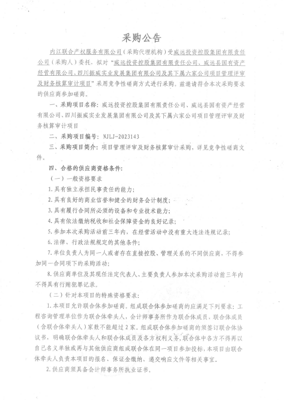 威远投资控股集团有限责任公司、威远县国有资产经营有限公司、四川振威实业发展集团有限公司及其下属六家公司项目管理评审及财务核算审计项目采购公告