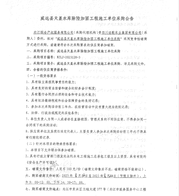威远县八栋桥水库除险加固工程施工单位采购公告