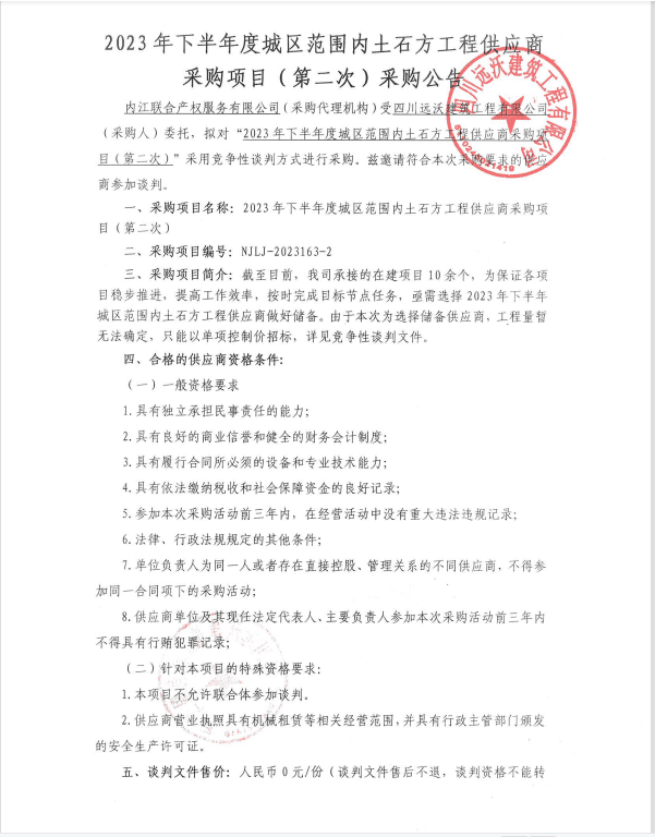 2023年下半年度城区范围内土石方工程供应商采购项目(第二次)采购公告