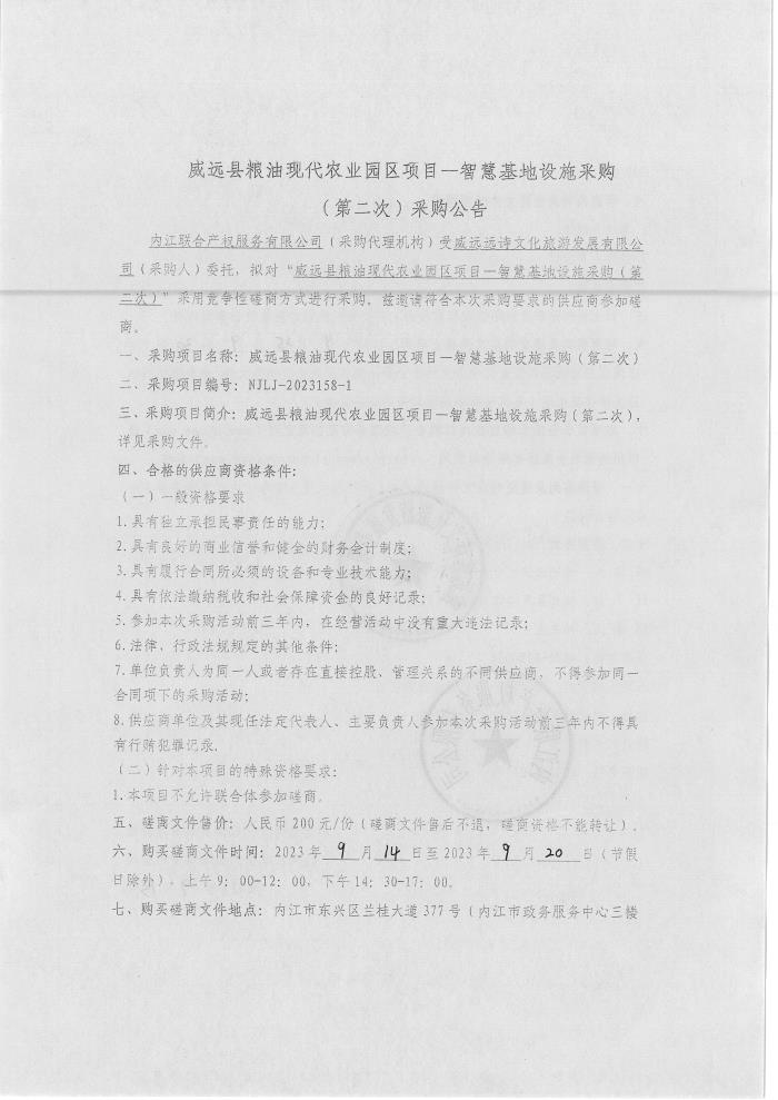 威远县粮油现代农业园区项目—智慧基地设施采购(第二次)采购公告
