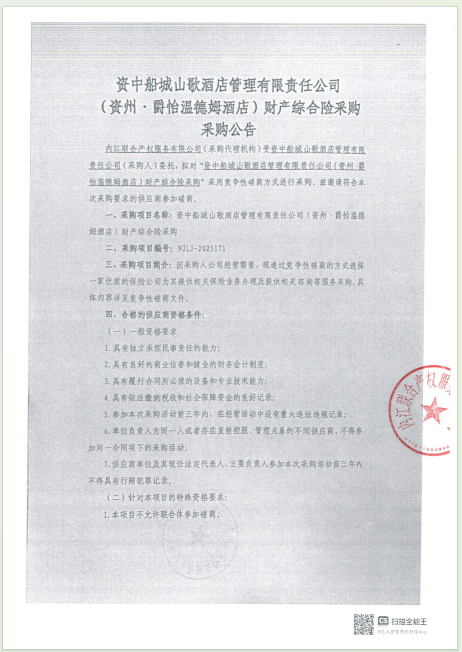 资中船城山歌酒店管理有限责任公司(资州·爵怡温德姆酒店)财产综合险采购采购公告