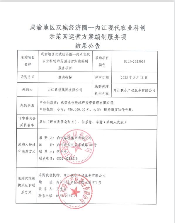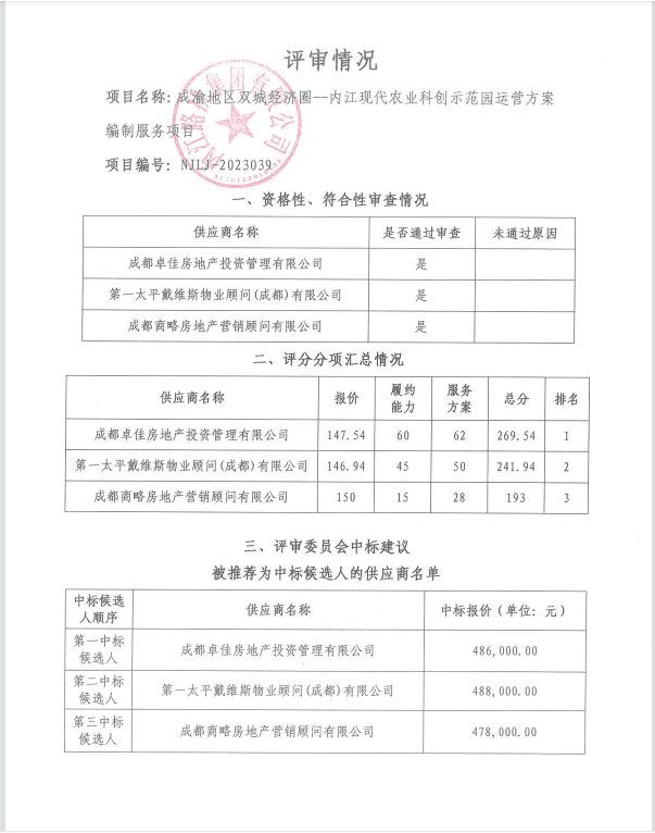 成渝地区双城经济圈--内江现代农业科创示范园运营方案编制服务项目结果公告