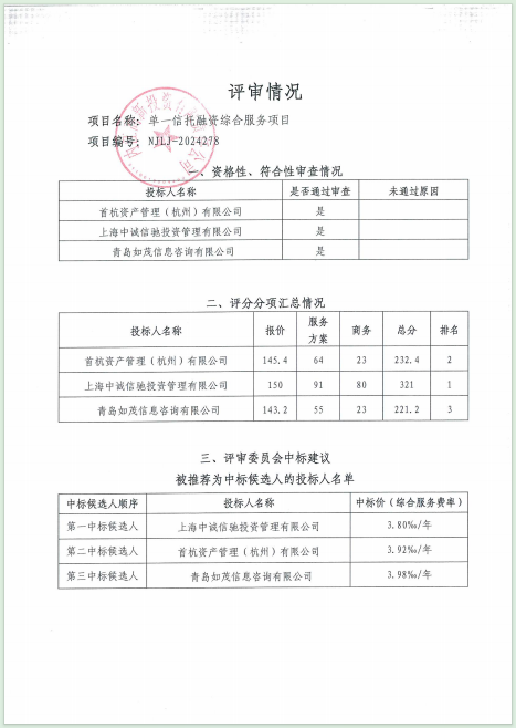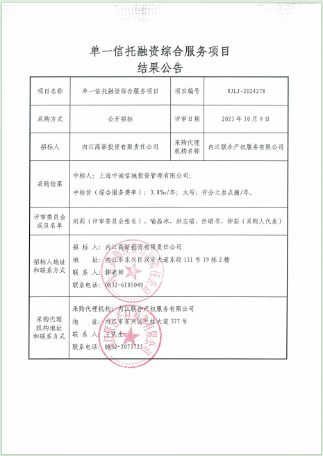 单一信托融资综合服务项目结果公告