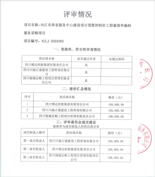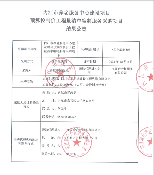内江市养老服务中心建设项目预算控制价工程量清单编制服务采购项目结果公告