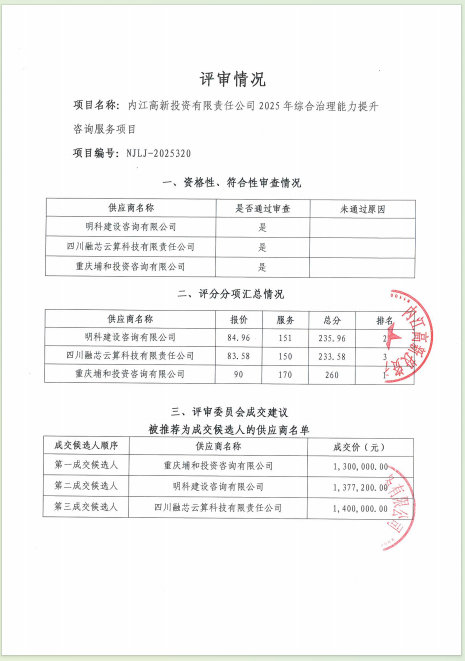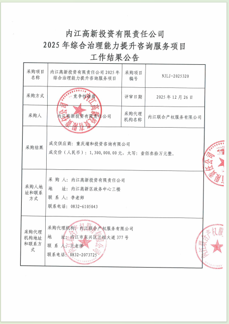 内江高新投资有限责任公司2025年综合治理能力提升咨询服务项目结果公告