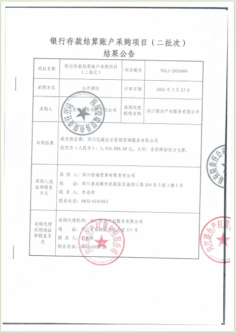 银行存款结算账户采购项目(二批次)结果公告